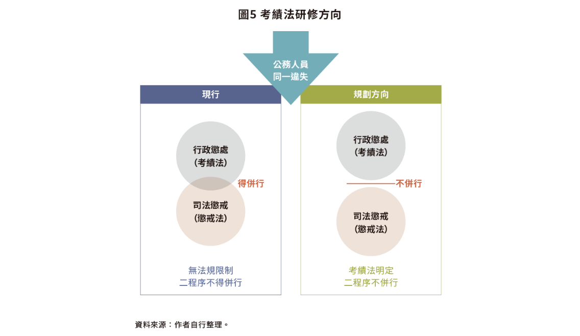 為了更精進公務人員考績法制,銓敘部於2021年6月30日提出考績法修正草案,再依憲法法庭判決意旨,進一步調整條文,強調年終考績丁等應是對受考人全年整體表現已達不適任程度的考核,而非對特定違失行為的處罰,同時明定機關不得就公務人員同一違失併行行政懲處及司法懲戒程序,確保公務人員免於雙重程序負擔(如圖5)。