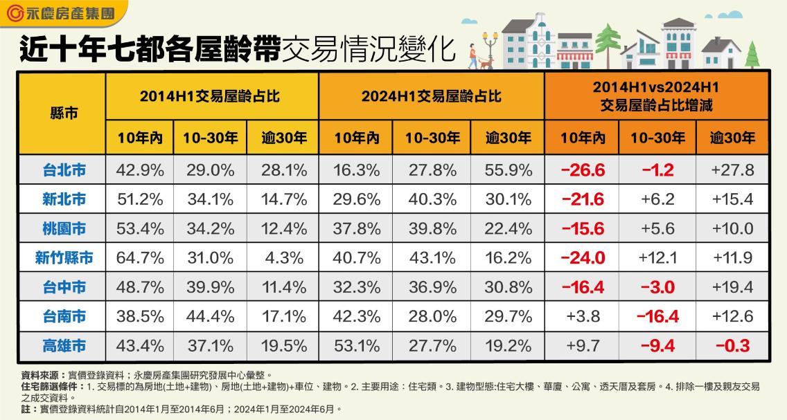 隨著新屋價格持續高漲,價格相較實惠的「高齡房屋」也漸成交易主流。永慶房產集團比較七都2014年上半年與2024年上半年的交易屋齡占比變化,發現台北市逾30年以上住宅交易占比增加近30個百分點,10年內新屋則驟降26.6個百分點,而七都中僅有台南、高雄市新屋交易占比增加。