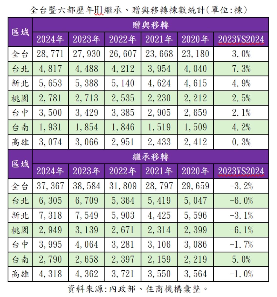 政府近期針對多房者課以重稅,全台「富爸媽」們紛紛卯起來送房,住商機構盤點內政部統計,全台上半年贈與、繼承移轉棟數達2萬8771、3萬7367棟,創下自1991年有統計以來同期最高與次高紀錄,住商不動產企劃研究室執行總監徐佳馨分析,近期政府推出選擇性信用管制,加上7月「囤房稅2.0」上路,高資產族為達節稅功效,大多選擇贈與房產與親人,致使贈與移轉棟數成長不少。