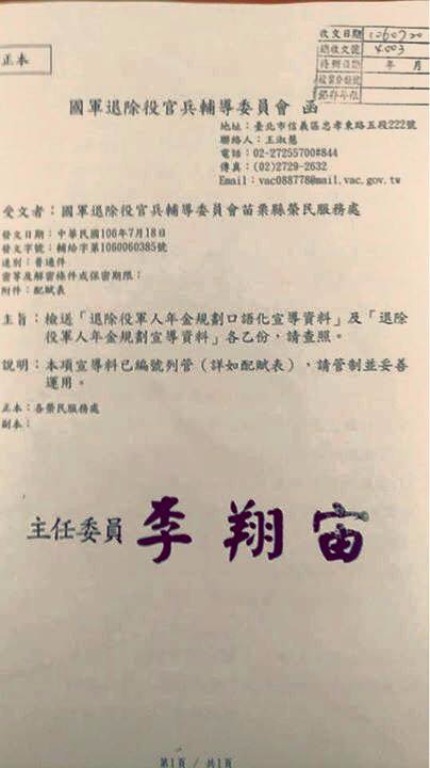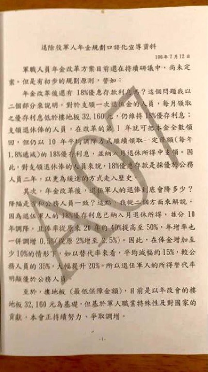 而這份流出的公文資料,也在部分退軍社群廣傳。退輔會指出,公文是退輔會本部18日發放到各縣市榮服處的文書資料,但目前都僅是「研議中」方案的相關內容,還不等於是政府最確切的軍人年改方案版本。年改會副召集人林萬億更是隨即跳出來澄清,說這些都是不正確、片面且不完整的資訊,必須等現役軍人退休俸給新制確定後,才會處理18%退場問題,「還沒這麼快」。