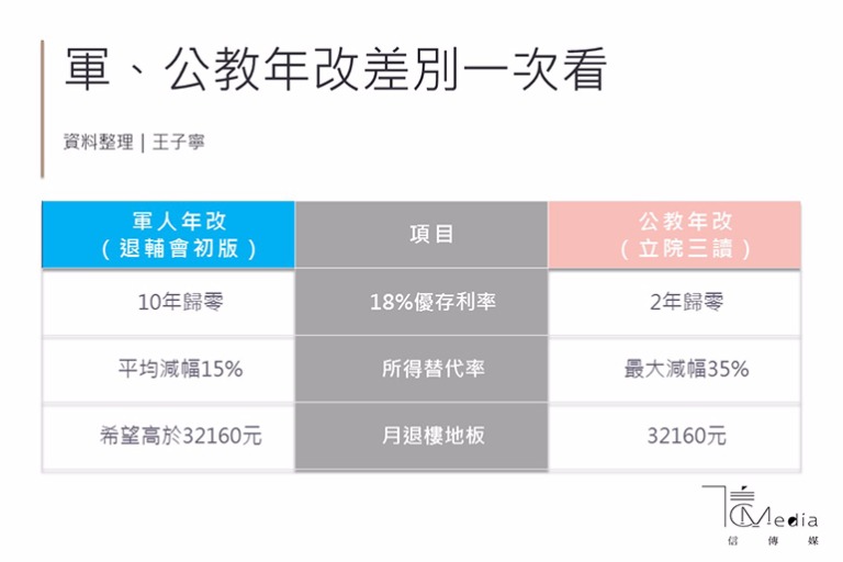 退輔會就指出,18%優存利息以更為緩進的方式走入歷史,所得替代率平均減幅也低於公務人員方案,所以無論是優存利息或所得替代率,明顯都優於公務人員。退輔會副主委李文忠日前也宣誓,軍人年改在立法院下會期處理,制度「一定比公教年改好」。