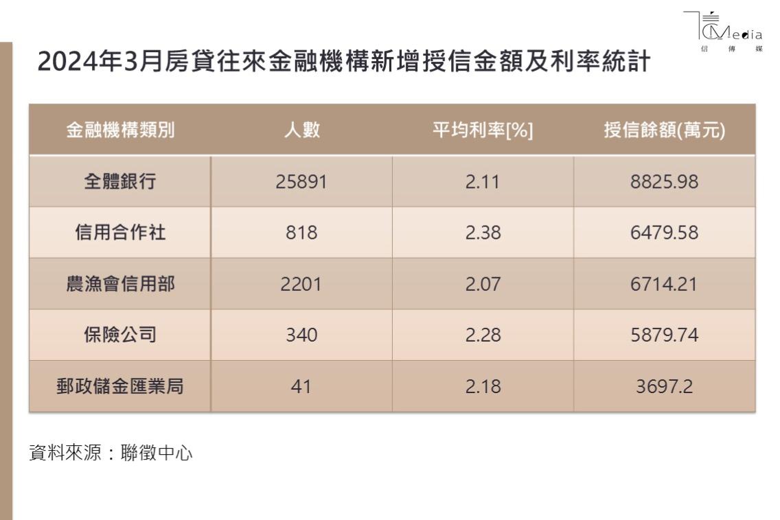 根據聯徵中心統計,今年3月國人申請房貸絕大多數還是跟銀行申請,人數約2.58萬人,占比達到88%,其次則是農漁會信用部約有2201人申請房貸,占比約8%,信用合作社則是818人占比約3%,保險公司僅有340人,占比1%,由於銀行房貸趨於吃緊,購屋人可嘗試詢問非銀行體系的貸款條件。