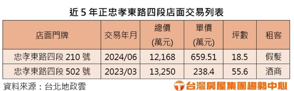 今年6月東區店面新交易,三位自然人以1億2168萬,無貸款買下忠孝東路四段210號約18坪的小店面,換算平均單價達659.5萬,創下東區近7年的店面單價新高。該店面之前的租客為服裝零售業,目前已經轉入百貨櫃位,而目前店面正裝潢中,據了解,隔壁店面租客假髮業者接手承租。