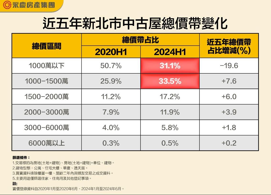 永慶房產集團彙整實價登錄成屋交易資訊,觀察新北市近五年中古屋成交總價帶的占比變化,可以發現1000萬元以下的住宅交易占比從2020年的51%下滑至2024年的31%。而1000-1500萬元總價帶交易占比在2024年正式超車,成為新北市2024年主力總價帶。