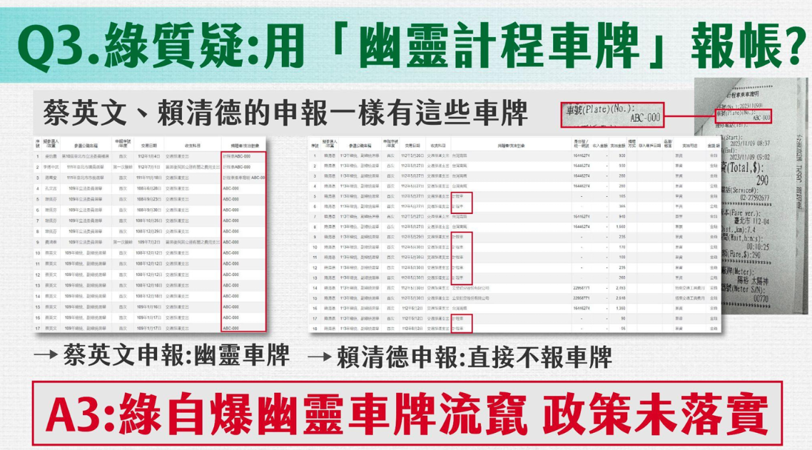 另外,關於綠營質疑,民眾黨用「幽靈計程車牌」報帳,黃珊珊則回擊,前總統蔡英文也照樣有幽靈車牌(ABC-000),甚至現任總統賴清德的申報中連車牌都沒有。
