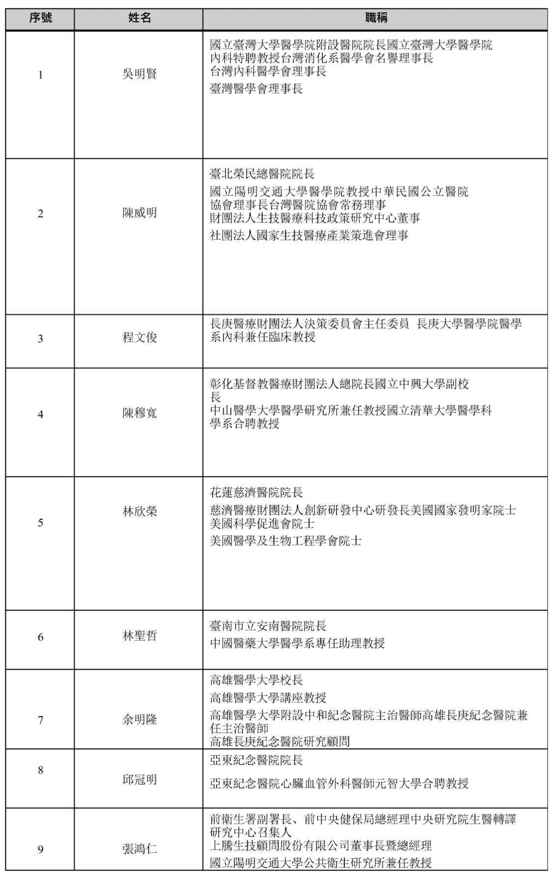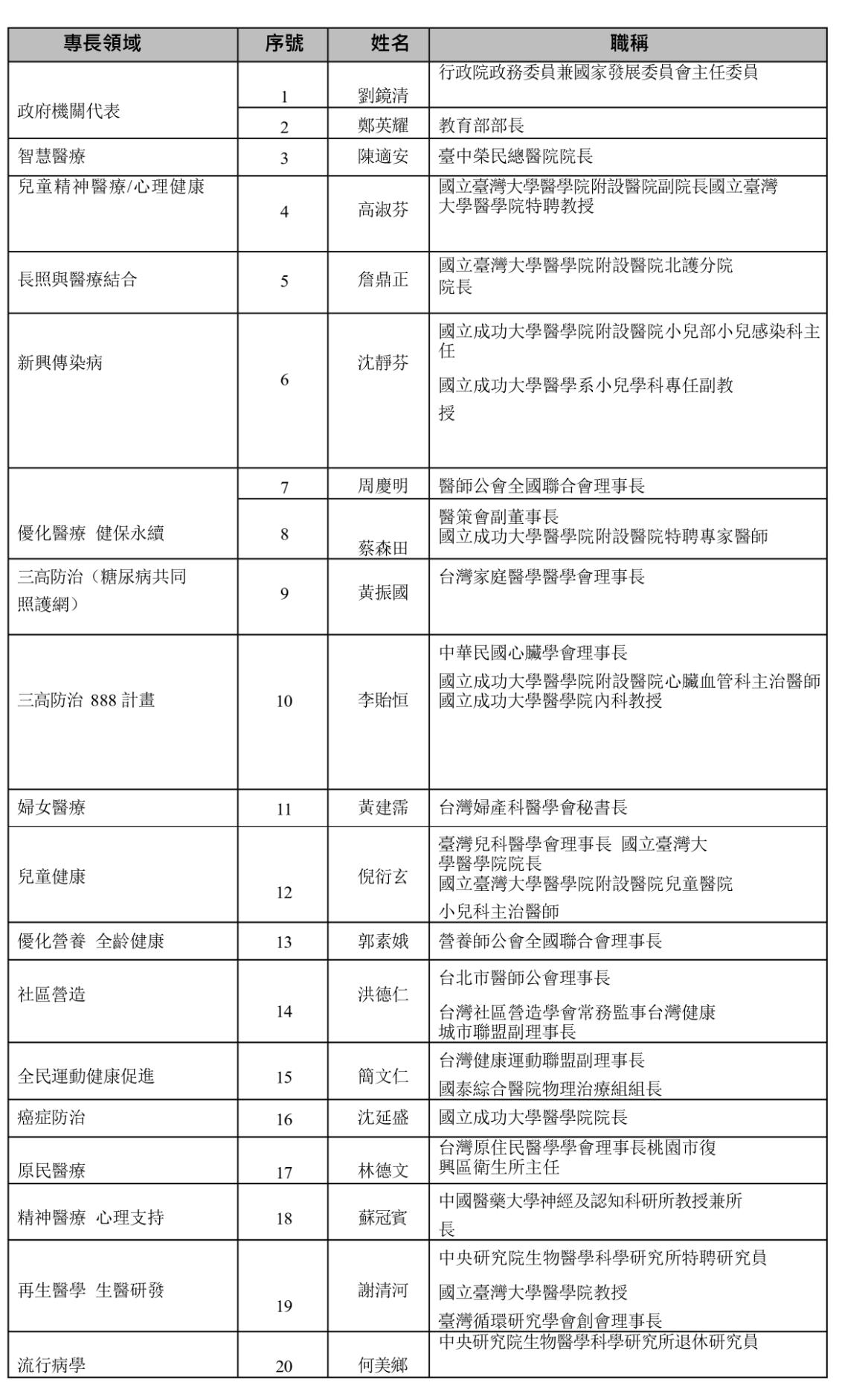 總統府今天公布「健康台灣推動委員會」20位委員及9位顧問名單如下: