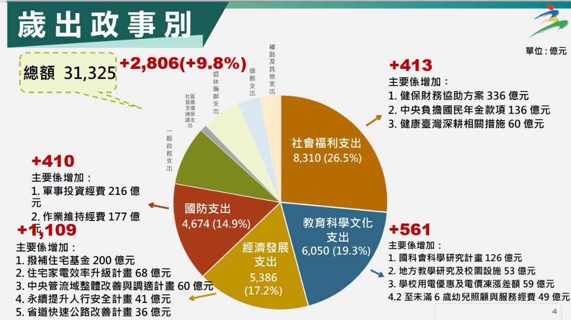 主計總處續指,各項政事支出中以社會福利支出編列 8,310 億元,占 26.5%,居首位;教育科學文化支出編列 6,050 億元,占 19.3%,居第 2 位;經濟發展支出編列5,386 億元,占 17.2%,居第 3 位;國防支出編列 4,674 億元,占 14.9%,居第 4 位。