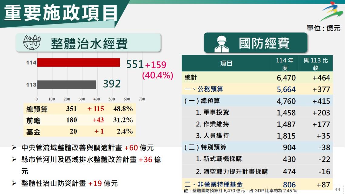 此外,整體治水經費在114 年度原匡列436億元,凱米颱風過後為加強辦理治水工作,經行政院邀集相關部會依各計畫之輕重緩急檢討後,再增列115億元,整體規模達551億元,包括總預算351億元、前瞻基礎建設計畫第5期特別預算180億元及特種基金20億元,較113年度相同基礎增加159億元,約增40.4%。