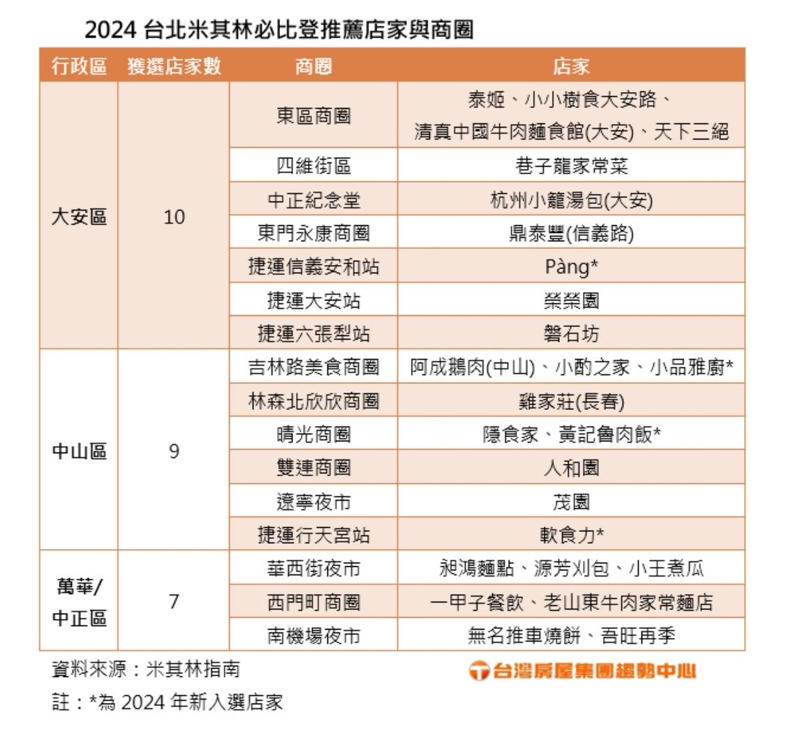 2024年必比登美食公布,若以區域分布來看,台北市以大安區最豐收,共有10間店上榜,且多分布在捷運沿線;而中山區以9家店獲選居次,中正萬華區合計也多達7家!