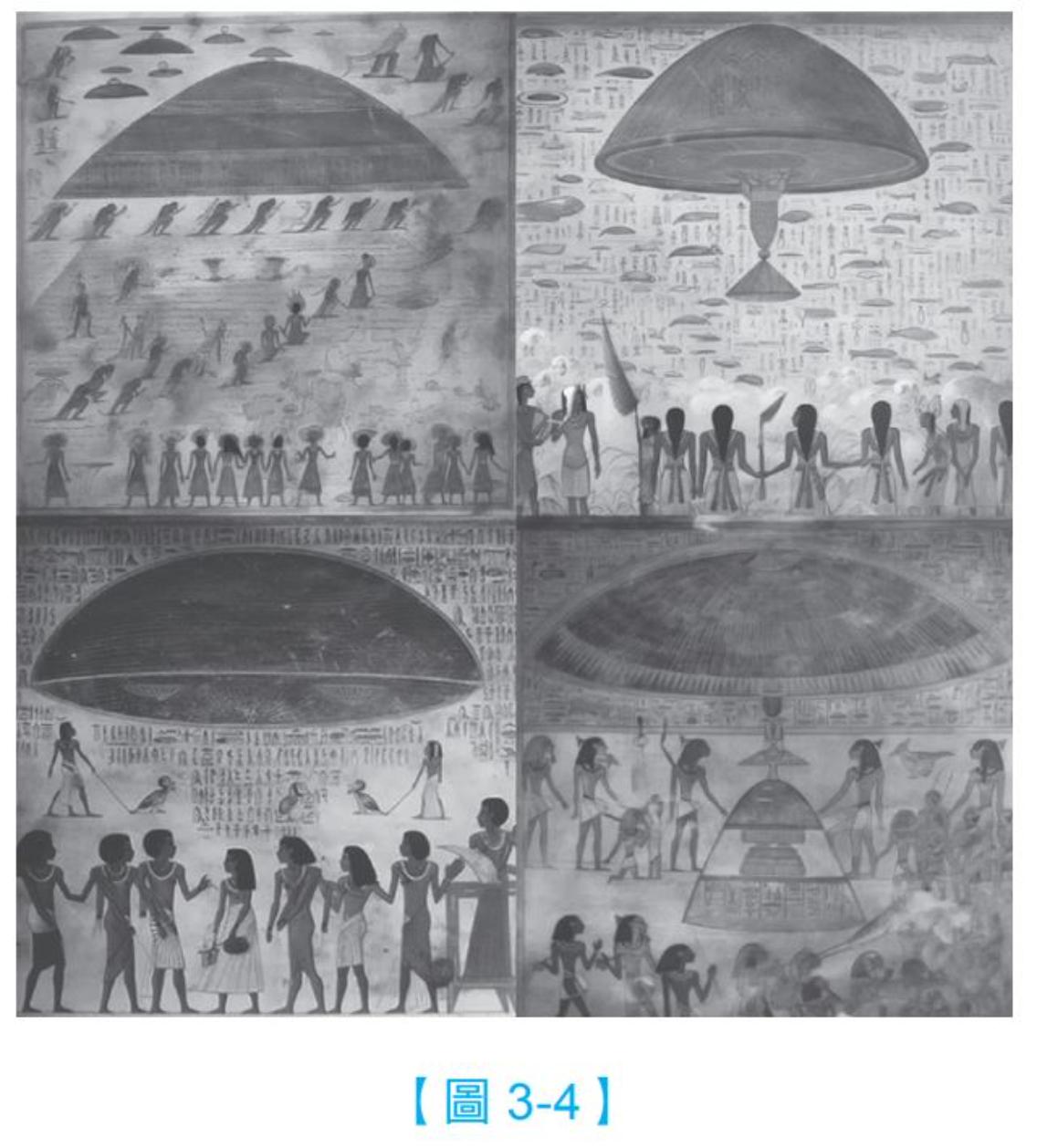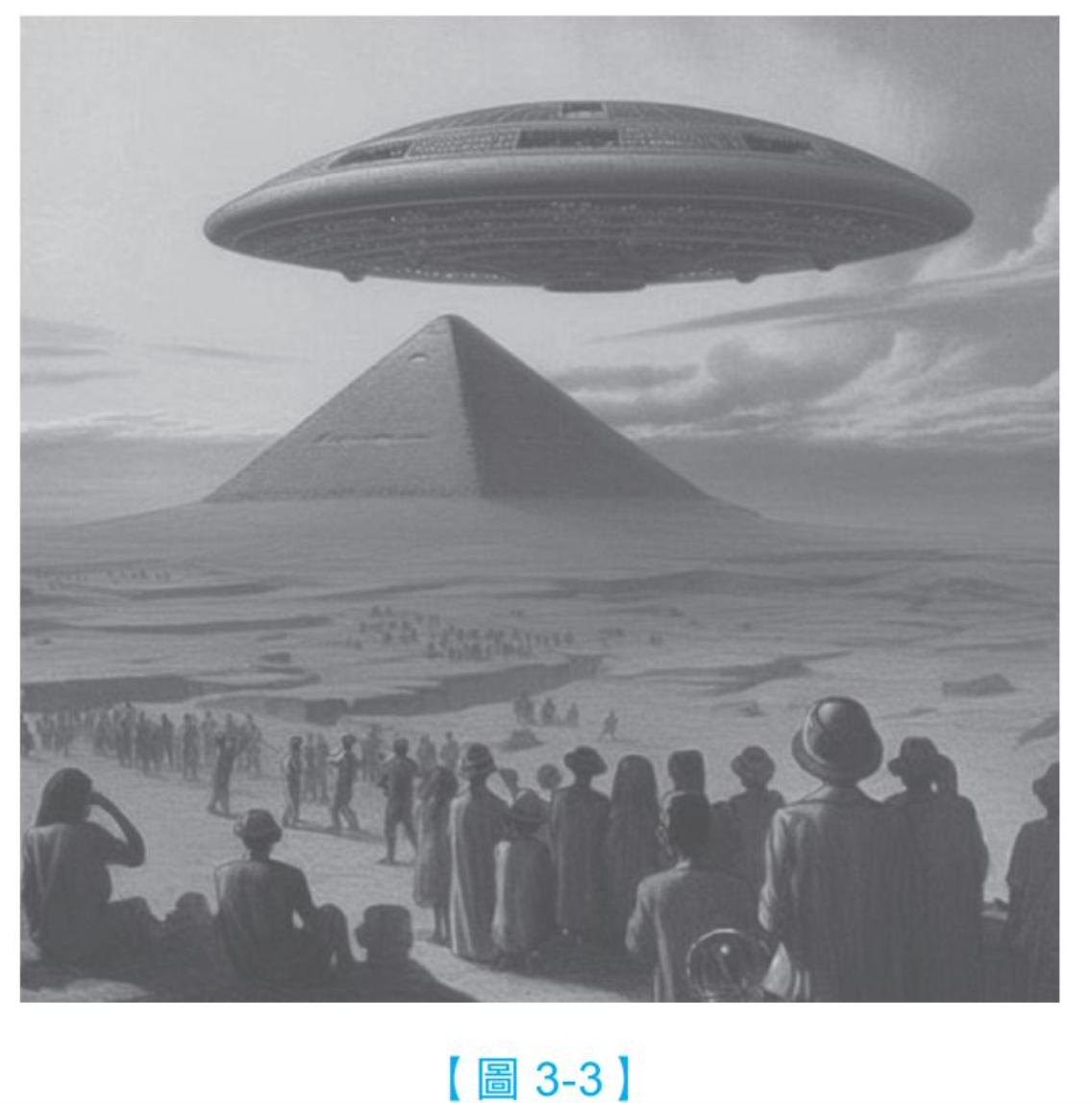 畫面中有個巨大的UFO懸浮在一座大金字塔附近的天空中。那個UFO亮著燈,似乎有很多扇窗戶,明顯不是地球文明的產物。地面是一片荒涼的大漠景色。很多人在抬頭看,他們三五成群,或站或坐,也許有幾十或上百人。