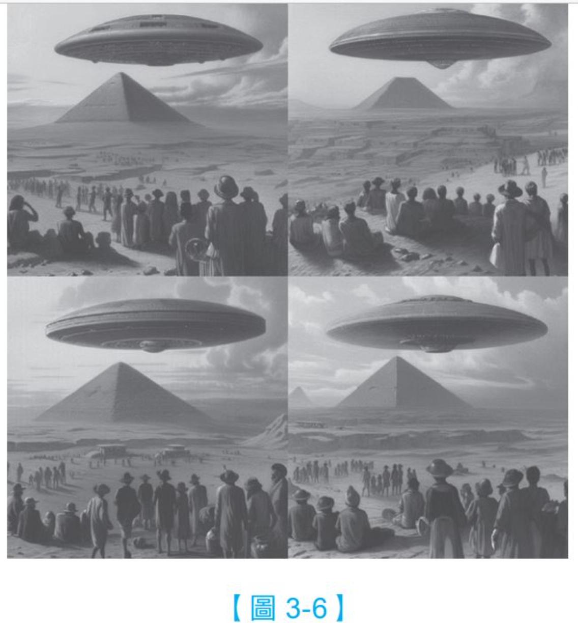 我認為畫得不夠好,就讓它重新畫。當然,我這麼做只需要點擊一個按鈕,但這畢竟也是一個貢獻。然後它又生成了4幅畫。(圖3-5)