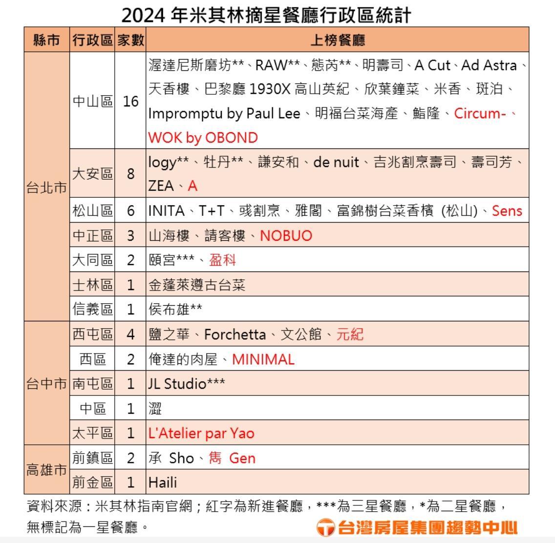 2024年米其林星級餐廳名單揭曉!本次獲得星級評等的餐聽共49間,其中包含了10間餐廳新進餐廳,以餐廳所在的區域來分,台北市中山區16間入榜居冠,大安區也有8間餐廳擠進榜單位居第二,松山區則以6間名列第三。中南部都會則是台中市西屯區表現最亮眼,一口氣有4間餐廳進榜,但享有美食之都盛名的台南,今年再度無緣上榜,在評比城市中顯得斯人獨憔悴。