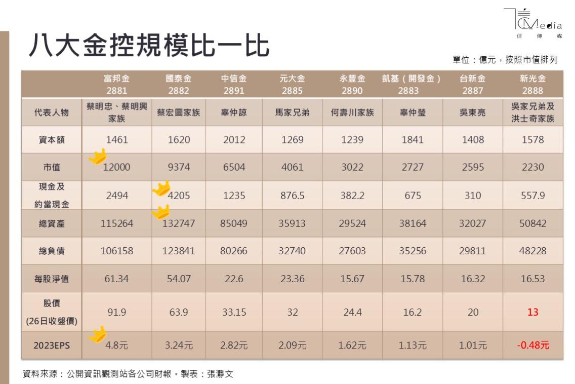 攤開八家民營金控財報,以市值來看,目前富邦金市值破兆、國泰金市值逼近兆元為金控兩大巨頭,中信金6500億元居第三、元大金4000億元第四、永豐金3000億元第五、凱基金2700億元第六、台新金的2600億元第七、新光金2200億元第八。