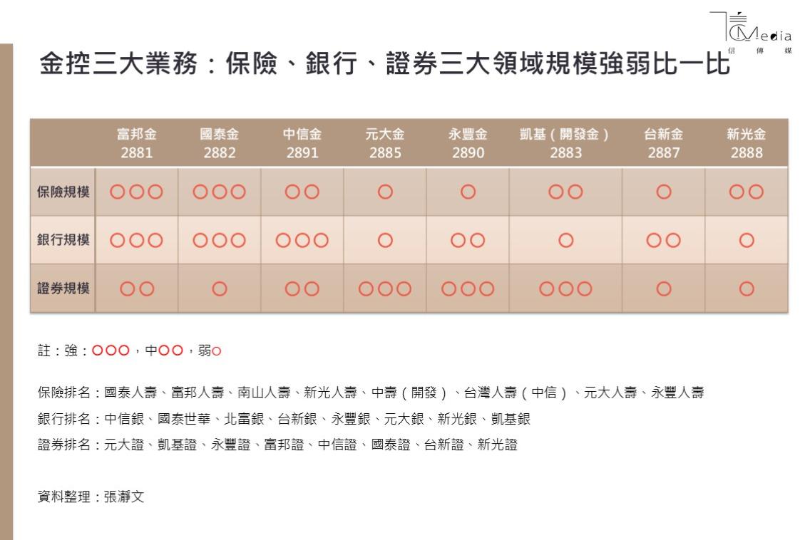 一直以來國泰金和富邦金「雙蔡」主導台灣金融版圖,國泰資產第一、富邦市值居冠,中信在銀行領先,元大在證券獨佔鰲頭。