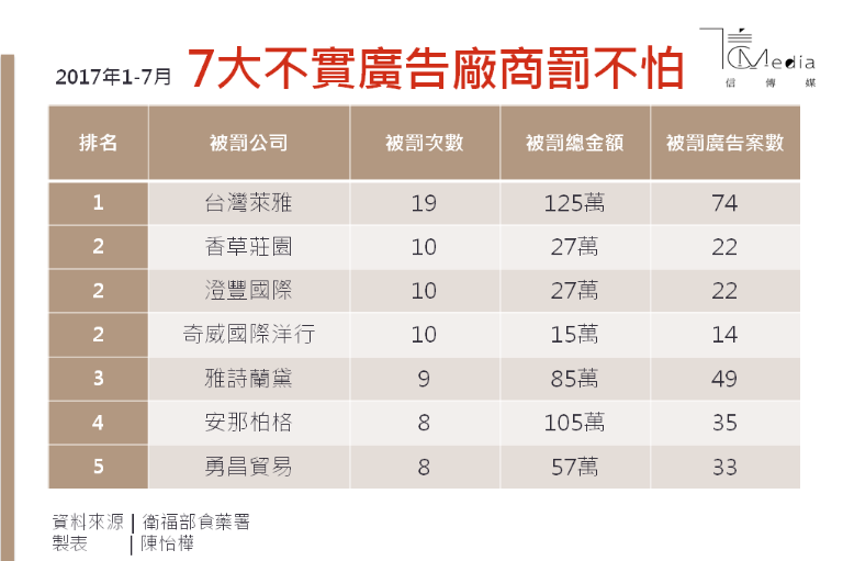 攤開裁罰名單,其實其中不乏國際知名大廠,像是萊雅集團在台灣的台灣萊雅,旗下有蘭蔻、YSL、植村秀、碧兒泉等專櫃品牌,還有媚比琳、巴黎萊雅、卡尼爾等開價品牌,在台灣的知名度都相當高。但今年1至7月台灣萊雅就被裁罰了19件,罰緩金額為125萬元,過去的裁罰統計當中,幾乎每次都坐穩「罰不怕」的冠軍寶座。