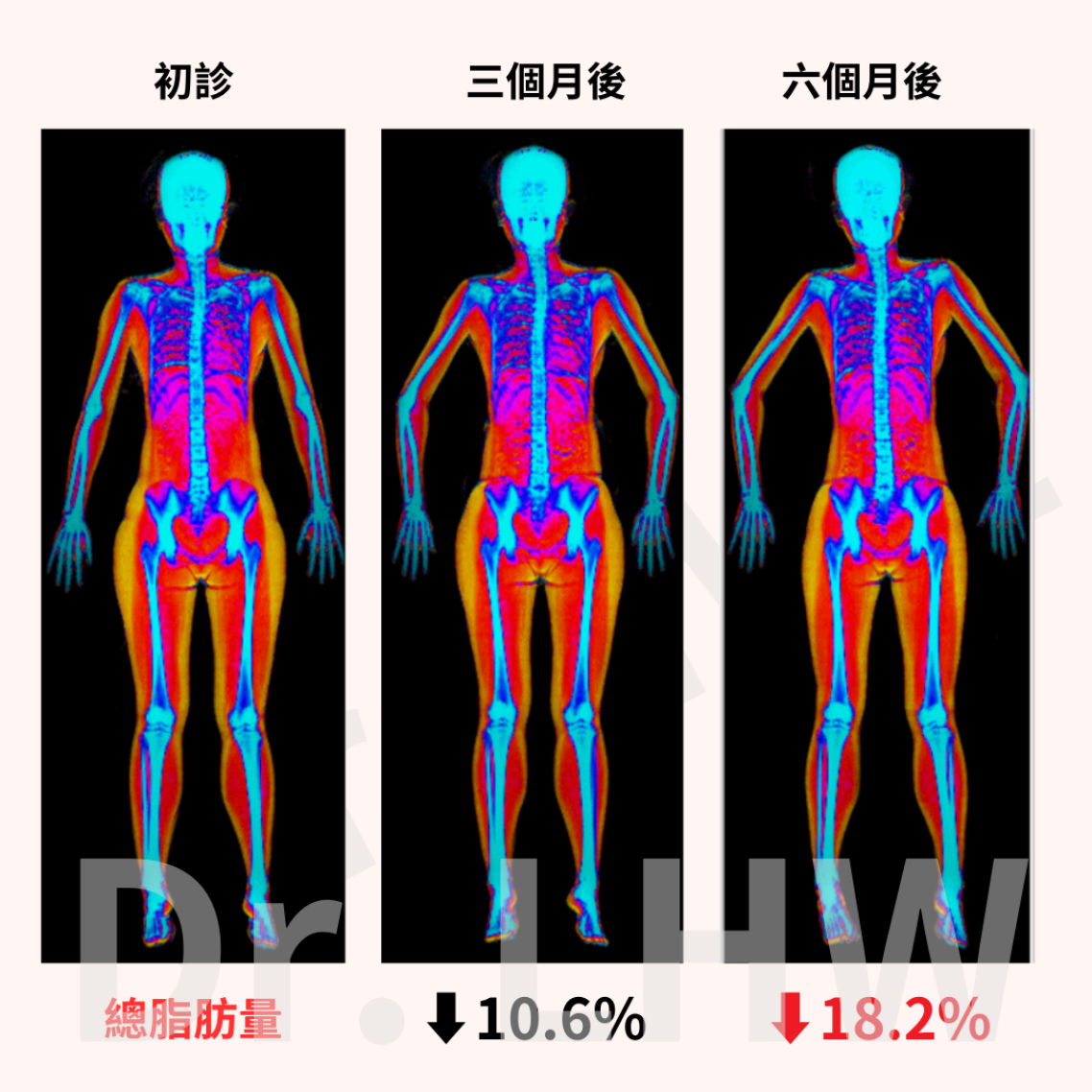 在初診時,陳小姐的BMI為19.1,屬於正常範圍,健康狀況良好。為了精確瞭解脂肪分布,接受雙能量掃描儀(DXA)身體組成分析,結果顯示脂肪主要集中在腰部、臀部和大腿。當時的脂肪量16.963公斤,總體脂率34.2%。