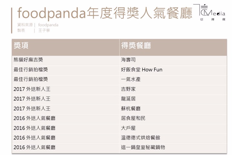 和foodpanda合作的餐廳超多5000間,哪家最好吃?台灣人最愛外送哪家?除了前面整理出台灣人必點美食餐廳外,foodpanda同時也再精選出10間人氣餐廳,分別頒發「2017 外送新人王」、「2016外送人氣餐廳」、「熊貓好麻吉獎」、「最佳行銷拍檔獎」等獎項,予以人氣美食餐廳殊榮。
