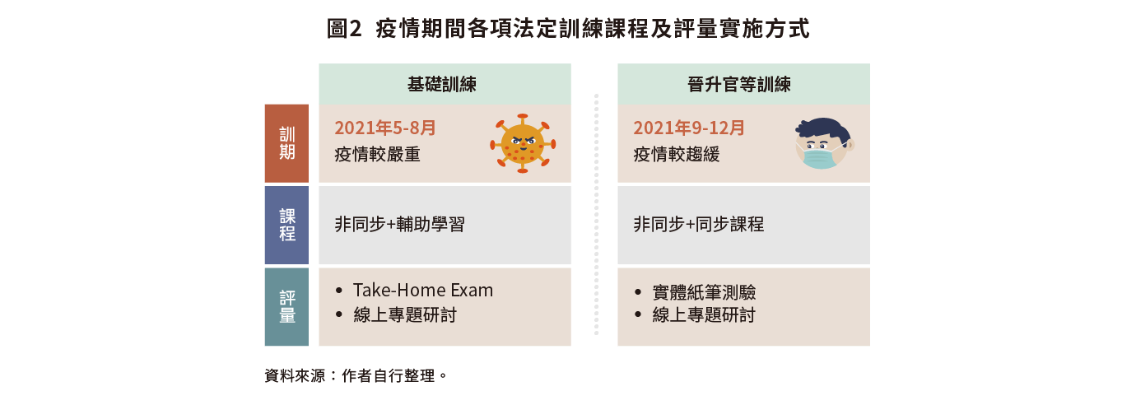 另外,晉升官等訓練也進行相應的調整,從2021年9月至12月,晉升官等訓練持續採取居家線上學習方式,同時納入了同步及非同步線上學習課程;在成績評量方面,則採取線上專題研討的方式(如圖2)。