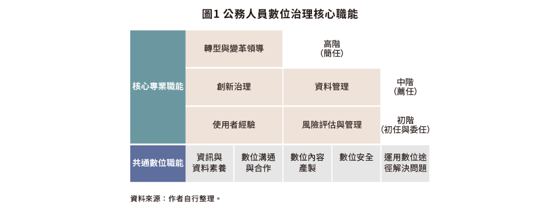 研究還發現,不同級別的公務人員也需要具備各自專業領域的數位治理技能,這些技能被分為「初階技能」、「中階技能」和「高階技能」,包括「轉型與變革領導」、「創新治理」、「使用者體驗」、「資料管理」以及「風險評估與管理」等等(如圖1)。
