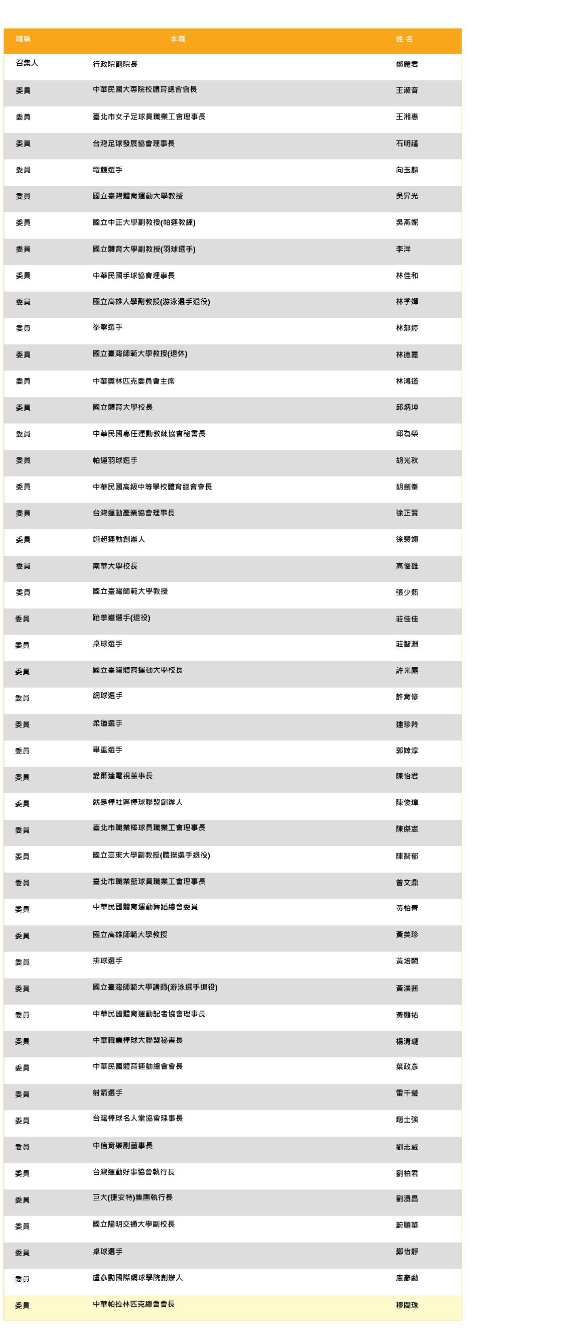 諮詢委員不單有出身運動員者,包括足球球評「左盃」石明謹、職棒裁判「通靈少女」劉柏君、棒球女主播「翊起運動」徐裴翊、愛爾達電視董事長陳怡君、巨大(捷安特)集團執行長劉湧昌、中華奧林匹克委員會主席林鴻道等各類體育界響噹噹人物,都與會提供寶貴經驗,並接受行政院長卓榮泰親自頒發委員聘書,而正式會議則由小組召集人即行政院副院長鄭麗君主持。