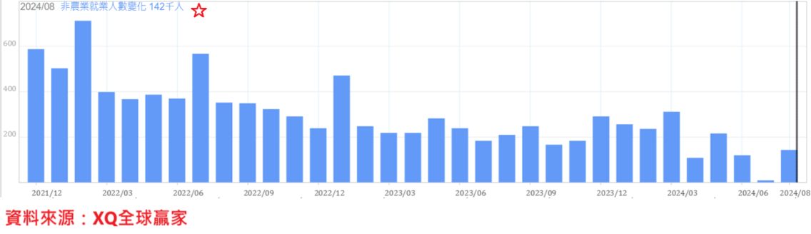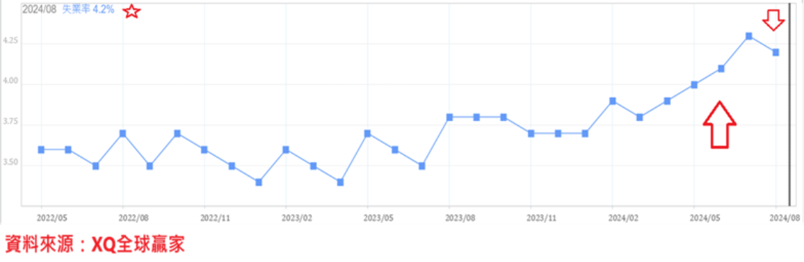 8月非農新增就業人口14.2萬人,低於市場預期的16.4萬人,且7月修正後數據自11.4萬下修至8.9萬人,隱含近兩個月新增非農業就業人口數成長動能連續轉弱。8月失業率自7月的4.3%,下降至4.2%,連續4個月上升後,首度小幅下降。