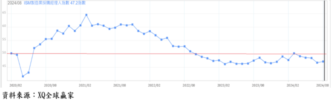 美8月ISM製造業採購經理人指數自7月的46.8小幅反彈至47.2,暫時結束連續4個月下降,但反彈幅度仍當小,且連續5個月回落代表景氣收縮的50以下,過去連續22個月,僅有1個月高於代表景氣擴張的50以上,顯示美國製造業景氣衰退危機仍相當沉重。