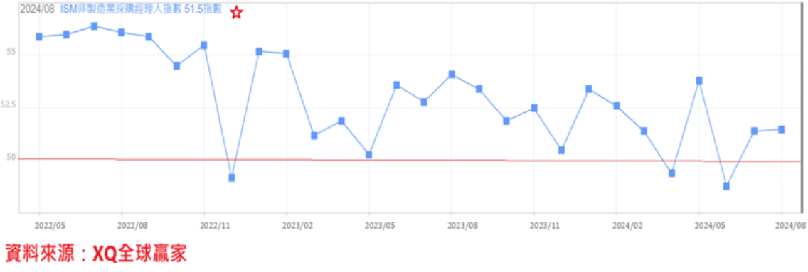 整體服務業產值佔美國GDP比重超過八成,美國8月ISM服務業指數自7月的51.4,微幅上升至51.5,連續2個月重回代表景氣擴張的50以上,緩解6月的48.8創2021年9月後的最低點,造成市場對美國總體經濟可能陷入大幅度收縮的疑慮。ISM服務業指數與ISM製造業指數若同步跌落代表景氣擴張與收縮臨界點50以下,美國總體經濟走向收縮危機相當嚴重。7月、8月ISM服務業指數連續兩個月重回代表景氣擴張的50以上,舒緩美國總體經濟衰退危機。