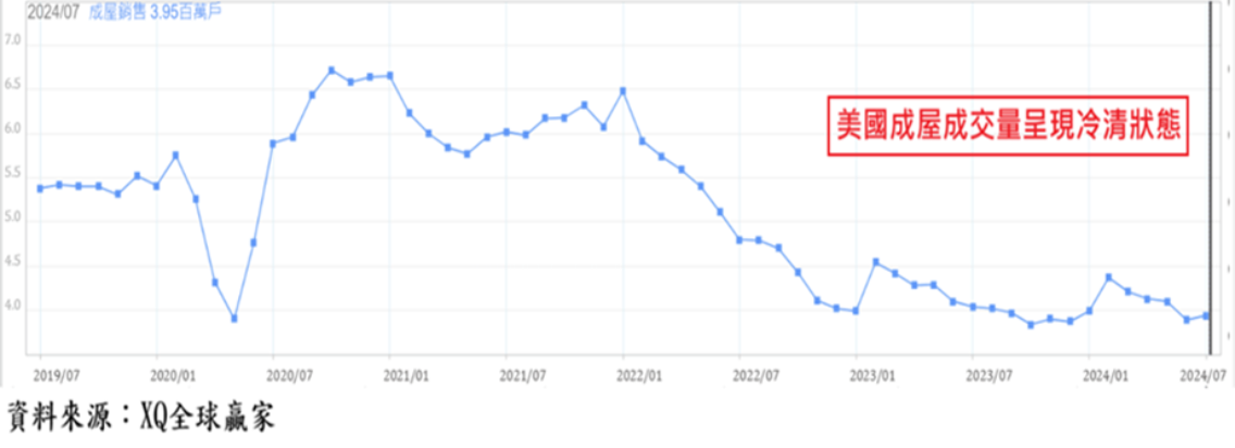 美國7月成屋銷售年率戶數,反彈至395萬戶,月增1.3%,連續四個月下降後,首度反彈,但仍年減2.5%,連續35個月呈現衰退。7月成屋房價中位數42.26萬美元,較6月歷史最高點42.69萬美元,小幅下跌1%,房價依舊呈現穩中透堅走勢,成交量依舊冷清,房價則仍在歷史最高點附近。近期呈現緩步下降,但仍處於長期高檔區的房貸利率,導致房市景氣成交量收縮,房市復甦徵兆仍相當微弱,成為房地產及眾多周邊產業景氣,甚至總體經濟擴張的隱憂。