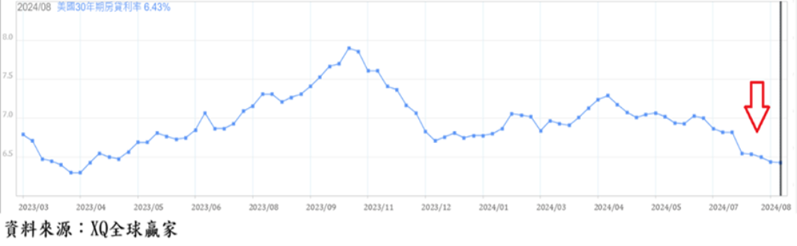 2023年10月美國30年房貸利率最高點7.9%,2023年12月下旬下降至6.71%,2024年4月底反彈至7.29%,隨美國長年期公債殖利率自高檔滑落,下降趨勢持續之中,30年房貸利率8月上旬持續下降至6.55%,8月下旬持續下降至6.43%,創2023年4月後最低點,顯示銷售量陷入長期低迷的房市,導致房貸資金需求持續萎縮,房貸利率緩步下降趨勢不變。