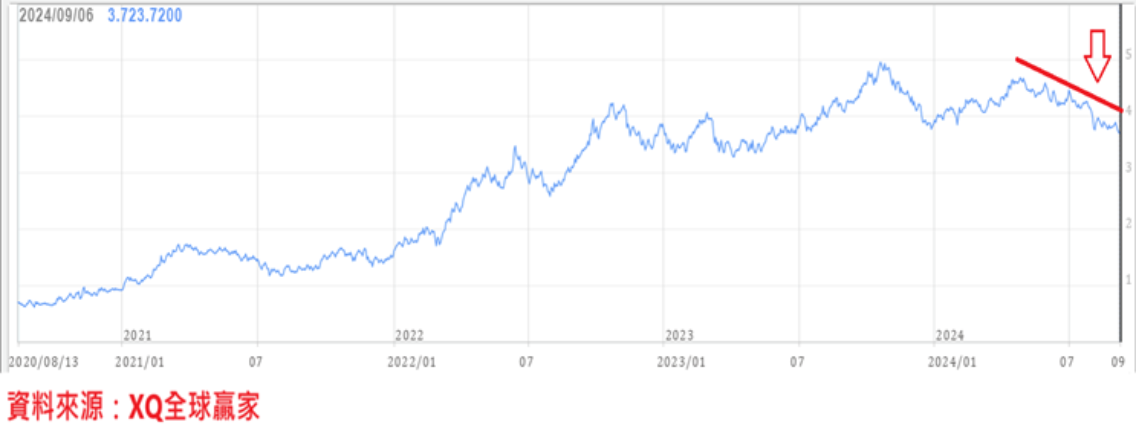 美國Fed自2023年7月開始,維持聯邦基金利率在5.25%至5.5%的高利率環境下,投資及消費總額需求終將因高利率而減弱,必將導致總體經濟總額需求下降,在總額供給沒有太大非經濟因素干擾下,財貨均衡價格終將下降,實際所得(GDP)亦將縮減,總體經濟擴張循環曲線亦將向下收縮,投資者僅能期待景氣收縮幅度不致演變成景氣衰退,以目前美國ISM服務業指數與近期申領失業救濟金人數觀察,美國經濟陷入衰退機率暫時不高。