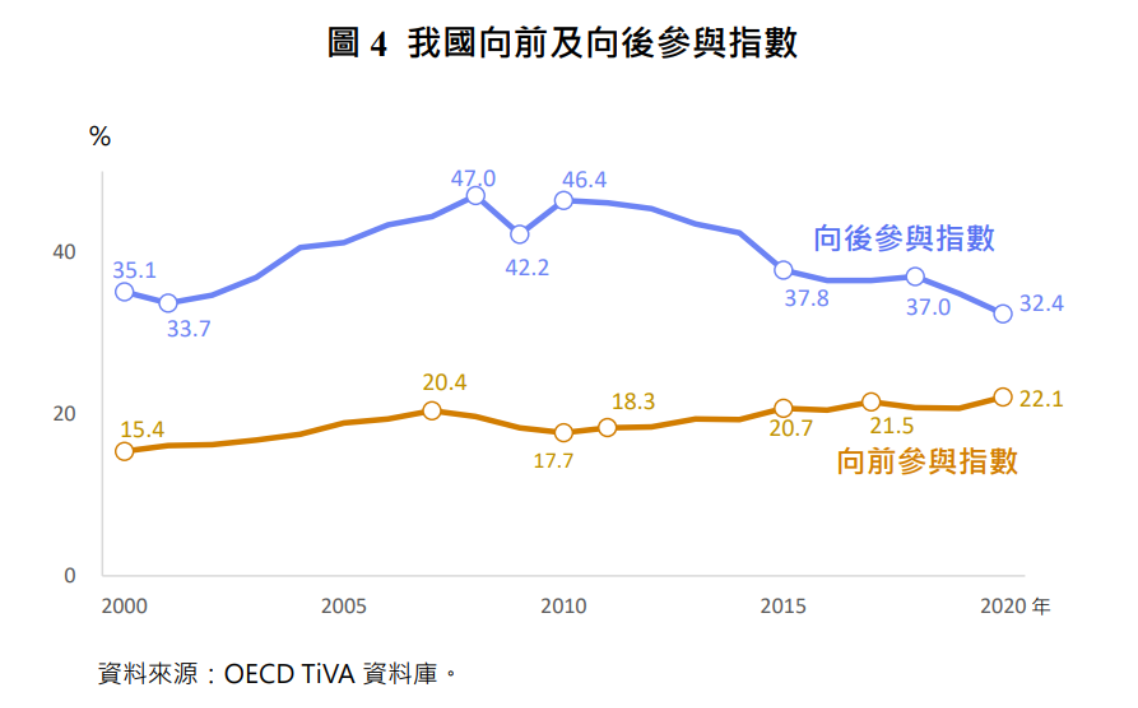 台灣的向後參與指數,即對進口原材料或半成品的依賴,從2000年到2010年快速上升,但到了2020年降至32.4%,為自2000年以來的最低水平,相較於2008年的高點47.0%,下降了14.6個百分點。