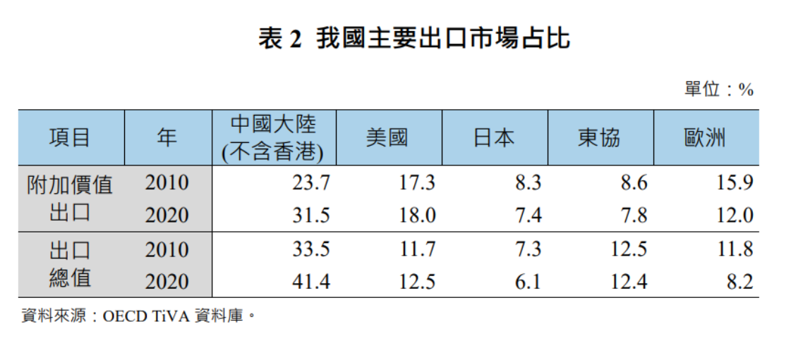 與此同時,台灣出口結構也出現變化,對中國的附加價值出口依存度僅為31.5%,比出口總值低近10個百分點,對美國和歐洲的附加價值出口比例則高於總值,顯示台灣在歐美市場更具優勢。