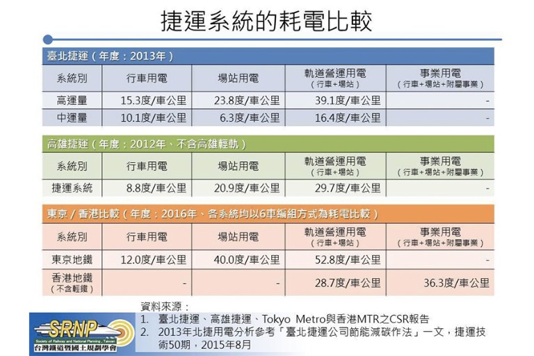 台灣鐵道暨國土規劃學會研究小組最近撈取了北捷與高捷的耗電數據,並且因為剛好有參考資料讓原本CSR裡面只有總量的數據可以拆分為高運量與中運量,於是獲得蠻具有參考意義的資料。為了交互進行比較,我們又同時找了香港、東京的耗電量資料進行比對。