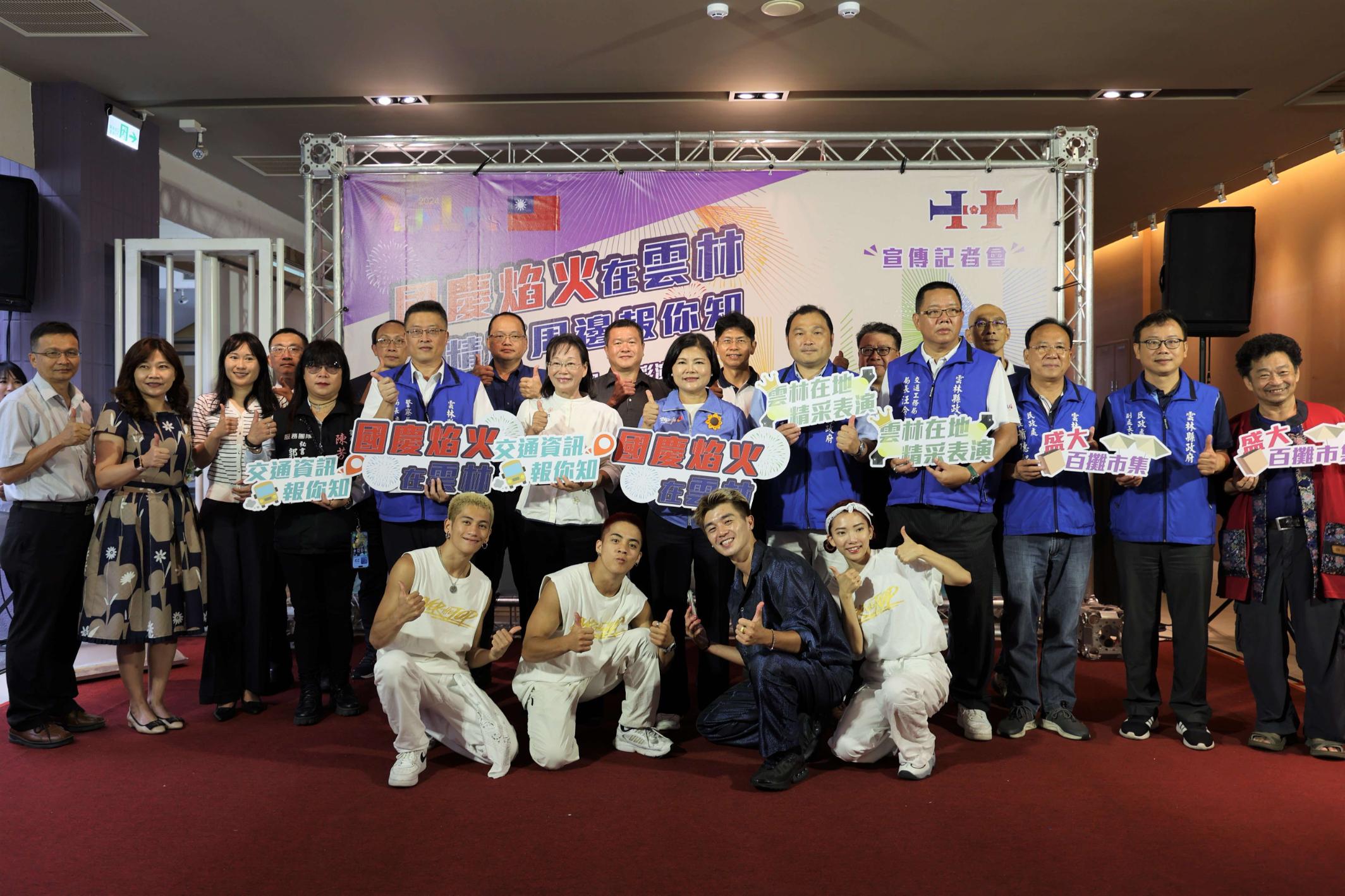 2024國慶焰火在雲林,雲林縣政府舉行「國慶焰火在雲林精彩周邊報你知」宣傳記者會。縣長張麗善、副縣長謝淑亞、計畫處長李明岳、雲林縣交通工務局長汪令堯、雲林縣警察局長李建民、民政處長蕭德恕、新聞處長陳其育出席宣布國慶日當天交通接駁、道路管制與停車場資訊。縣長張麗善請觀賞焰火民眾,儘量搭乘接駁車與公共運輸系統,輕鬆享受璀璨國慶焰火,欣賞雲林優秀藝文團體與大咖藝人表演,逛特色市集、吃美食、買雲林良品。