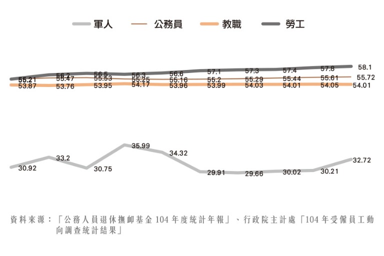 這是因為與退休福利優厚的軍、公、教相比,勞工的退休金可謂是「少到可憐」。其中按照統計資料顯示,平均退休金最高的依序是教職人員、中央政府公務員、軍職人員,墊底的則是受僱勞工(請見圖2-8)。然而,依照「公務人員退休、撫卹基金」的統計資料顯示,截至2016 年5 月底為止,參加退撫基金的軍、公、教人數各為155,223 人、289,376 人及187,354 人,總計有631,953 人之多。