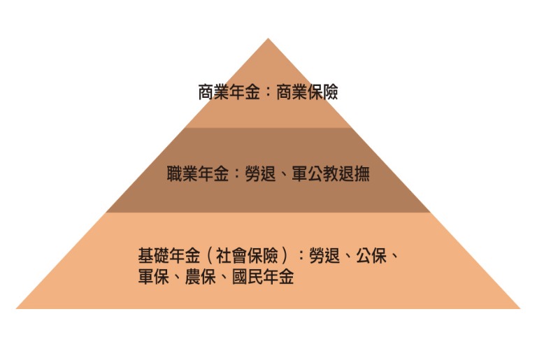 至於我國的三層退休金支柱,最底層的是被稱做「社會保險」的各種基礎年金,總共有勞保、公保、軍保、農保與國民年金;中層的是不同職業類別的年金,例如勞退及軍公教退撫制度;最上一層的,則是由民眾自行選擇購買的商業年金。