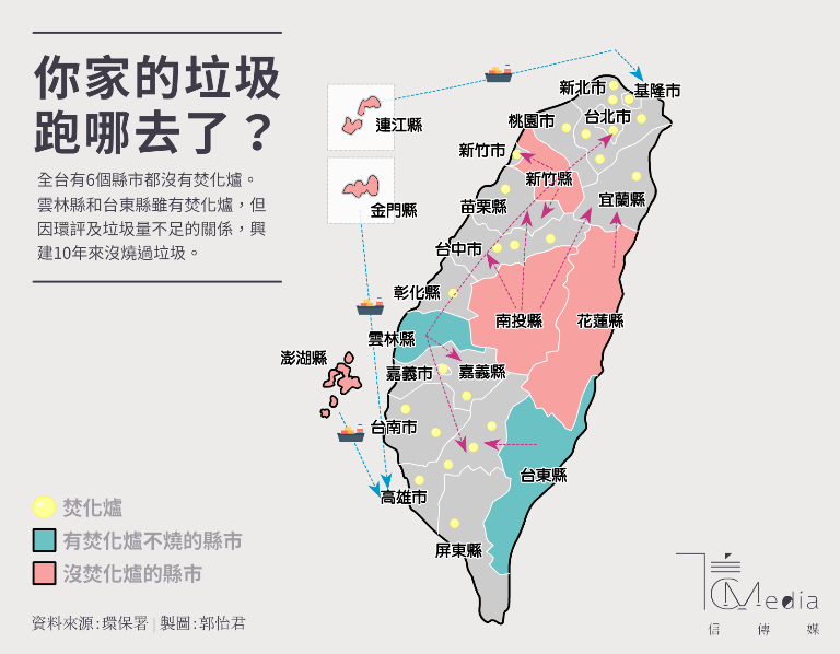 去年柯文哲一席「垃圾不分藍綠」,讓各縣市互打的「垃圾大戰」浮上檯面,事實上,除了台北、雲林之外,只要是沒有焚化爐的縣市,都曾經面臨這個問題,目前全台有6個縣市都沒有焚化爐,包括新竹縣、南投縣、花蓮縣與離島的澎金馬;雲林縣和台東縣雖有焚化爐,但因環評及垃圾量不足的關係,興建10年來沒燒過垃圾。