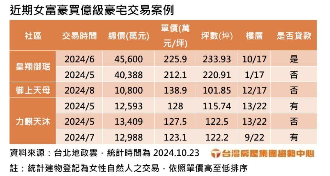 另外士林北投區也有女富豪買豪宅的案例,包括「御上天母」中樓層戶,8月成交總價1.08億元、每坪138.9萬元;「力麒天沐」中樓層戶,5月成交總價1.34億元、每坪127.5萬元,且都採現金無貸款的方式購入。