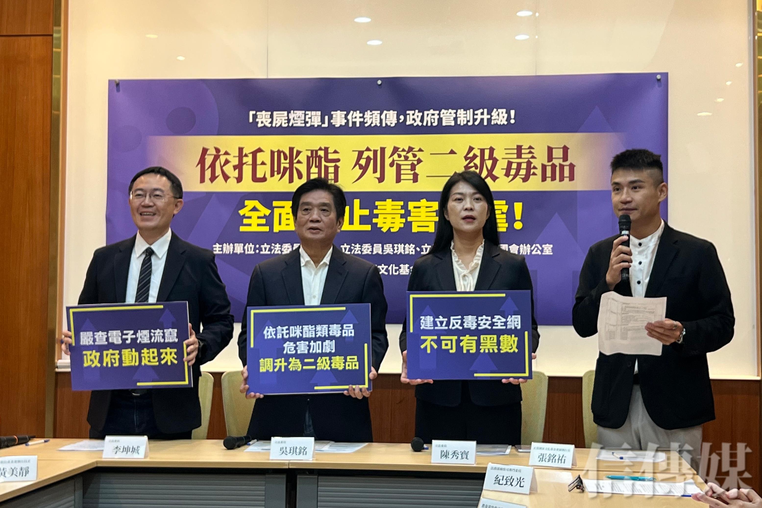民進黨立委高聲呼籲,應盡速將依托咪酯列管為第二級毒品,強化刑事責任。