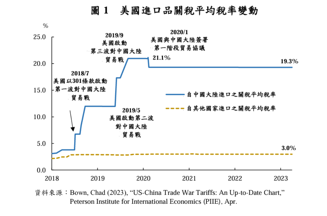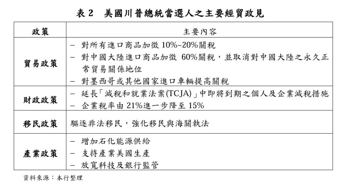 根據央行書面報告,2018年川普上台後,美國對中進口品平均稅率約19.3%,其餘國家則3%,立委賴士葆詢問,若川普實施高關稅政策,對中國課徵60%關稅、其他國家10%,會不會是場災難?