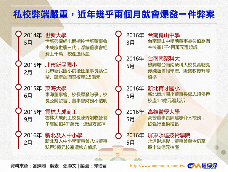 台南南榮科大校長黃聰亮涉嫌販售假學歷、販售教授升等資格,高醫大學生發起「透明革命」,抗議董事長陳建志強行介入校務,新北育才國小董事長郭志超侵吞校產1.4億元遭起訴……,光是5月就爆發三起私校弊端爭議。