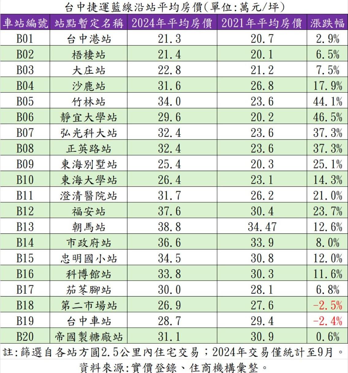 值得注意的是,台中捷運藍線各站點中,反而是台中車站周邊的B18至B20站,房價漲勢較顯侷限,賴志昶認為,上述區域位處台中市舊市區,周邊生活機能成熟,商業設施也相當豐富,惟區域市場供給以舊大樓、公寓物件為主,本身街廓環境較顯老舊,且商業氣息過於濃厚,讓該區房價表現較難有起色。