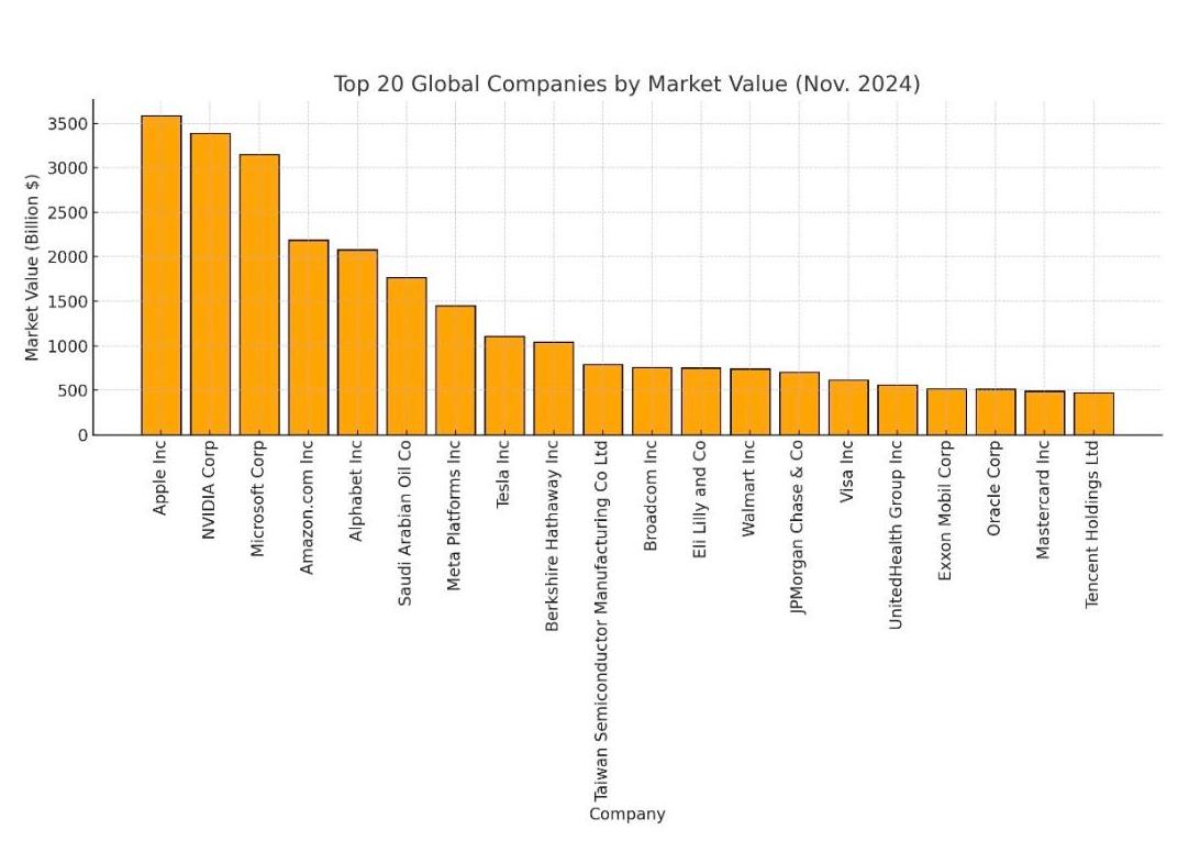 截至2024年11月30日,全球市值排名前20的公司榜單出爐,其中蘋果公司(Apple Inc.)、輝達公司(NVIDIA Corp.)和微軟公司(Microsoft Corp.)占據前三位置,反映了科技巨頭在市場中的主導地位。這份排名基於公司的市值(以十億美元計算),展示了全球頂尖企業的最新市場表現。