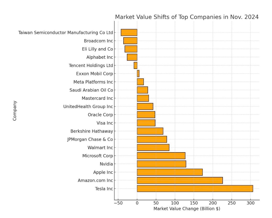 2024年11月,全球市值排名前20的企業中,特斯拉(Tesla Inc.)的市值增長最為顯著,增幅達305.95億美元,超過所有其他公司。而台積電(TSMC)、博通(Broadcom)等多家科技企業則市值下滑,反映出全球市場在科技創新與地緣政治影響下的複雜變化。