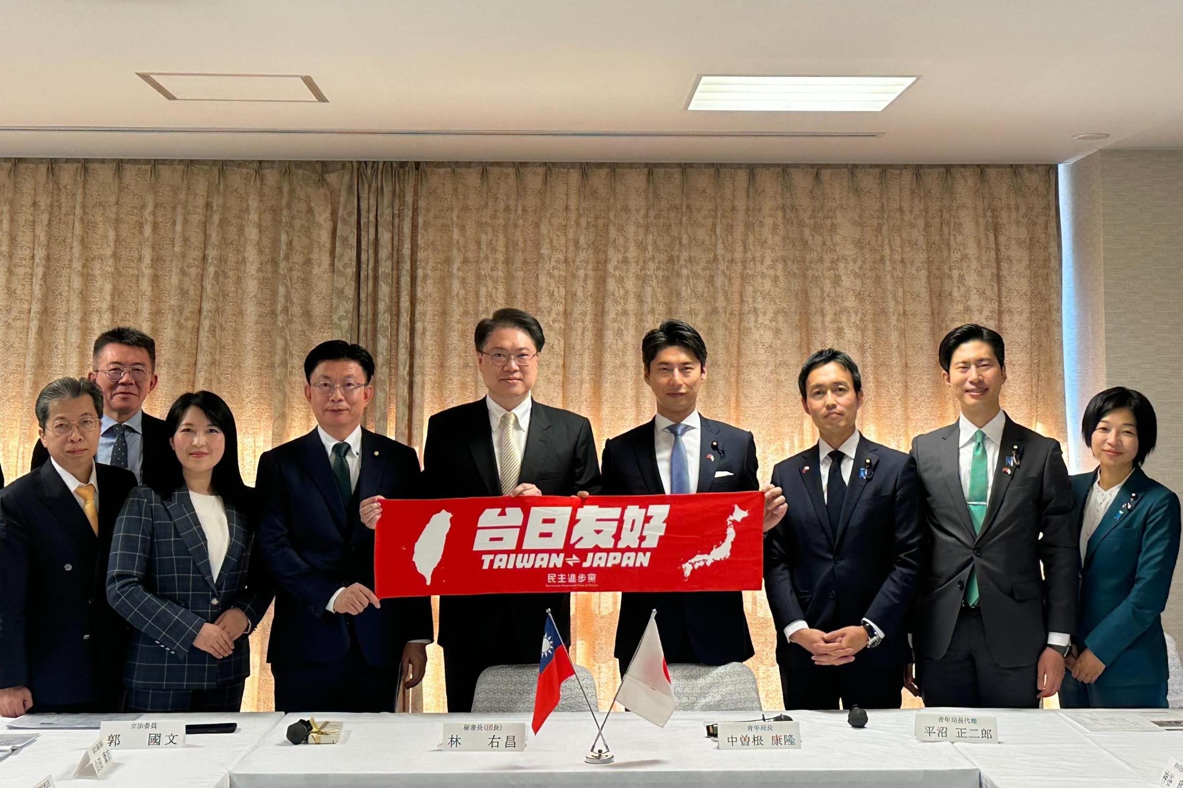 民進黨秘書長林右昌昨(9)日上午拜訪自民黨黨部並與自民黨森山裕幹事長、青年局中曾根康隆局長以及國際局代表等人進行閉門會談。
