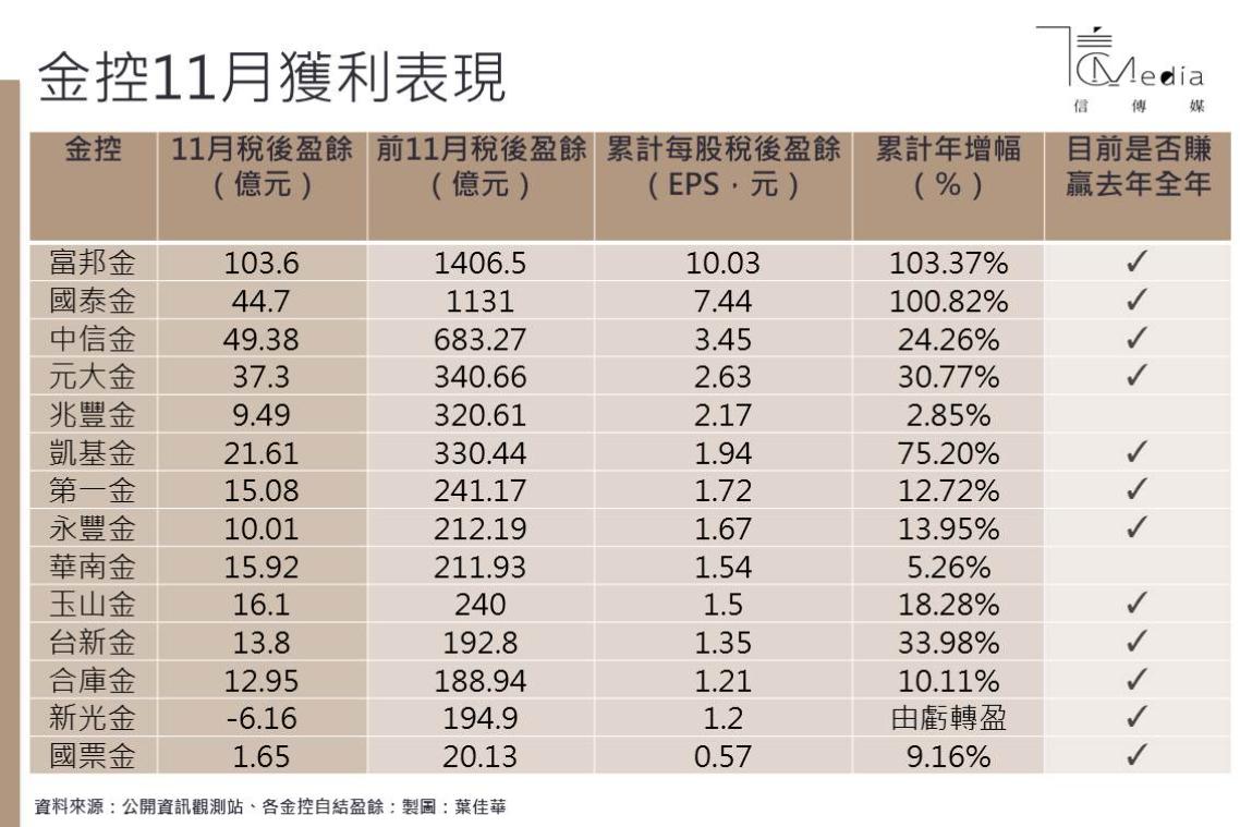 從個別金控來看,累計今年前11月獲利表現,其中,富邦金累計前11月稅後盈餘衝破1400億元大關,創下歷年次高紀錄,每股稅後盈餘(EPS)達到10.03元,成為累計獲利及每股獲利王;而國泰金前11月獲利也同樣衝破千億元大關,目前來到1131億元,每股稅後盈餘(EPS)7.44 元位居第二;統計金控雙雄前11 月獲利已占全體金控獲利高達44%。