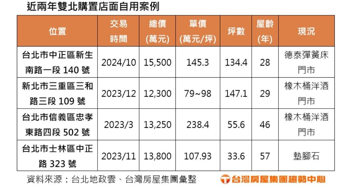 近兩年雙北市還有不乏業者買下店面自用的案例,包括去年「橡木桶洋酒」一口氣買了兩間店面做為營業據點,包括總價約1.33億元的信義區忠孝東路樓店,以及1.23億元的新北三重樓店;圖書文具店「墊腳石」,去年則以1.38億元買下士林的透店,也是從租客變屋主。