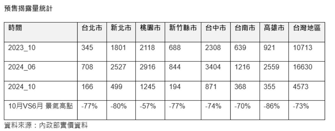 根據內政部實價預售最新統計資料顯示,10月全台預售揭露量約4600件,數量創下近20個月新低,比農曆年節當月數量還少,相較今年6月景氣高檔時月銷1.66萬件相比,房市受銀行資金緊縮與央行第七波選擇性信用管制,直接有效降低民眾對於房價上漲預期,市場領頭羊預售市場也受到衝擊。