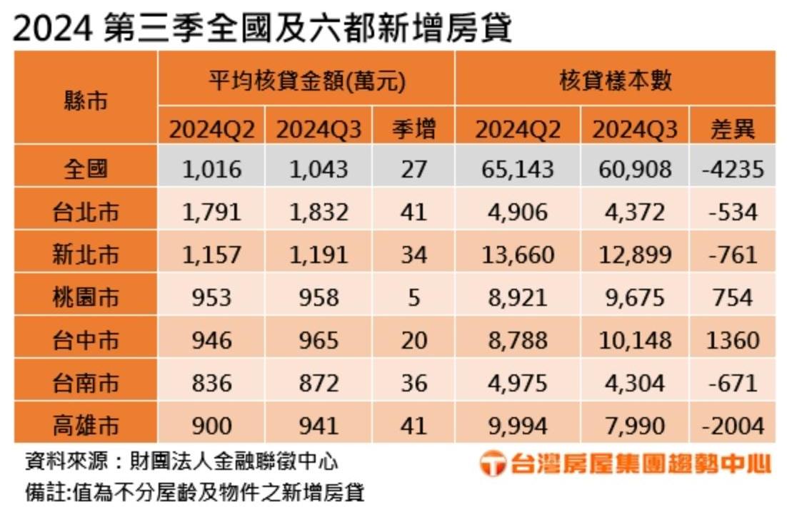 購屋越來越難?!台灣房屋集團根據金融聯徵中心新增房貸資料統計,全國及六都房貸壓力再創新高,第三季全台平均核貸金額1043萬元,平均貸款利率2.23%,均創15年新高。觀察六都,其中台北市Q3平均背負房貸達1832萬元,房貸壓力首度衝破1800萬元大關。而全國第三季整體核貸總數60,908件,比上一季減少4235件,顯示購屋交易和核貸腳步,已有放緩的趨勢。