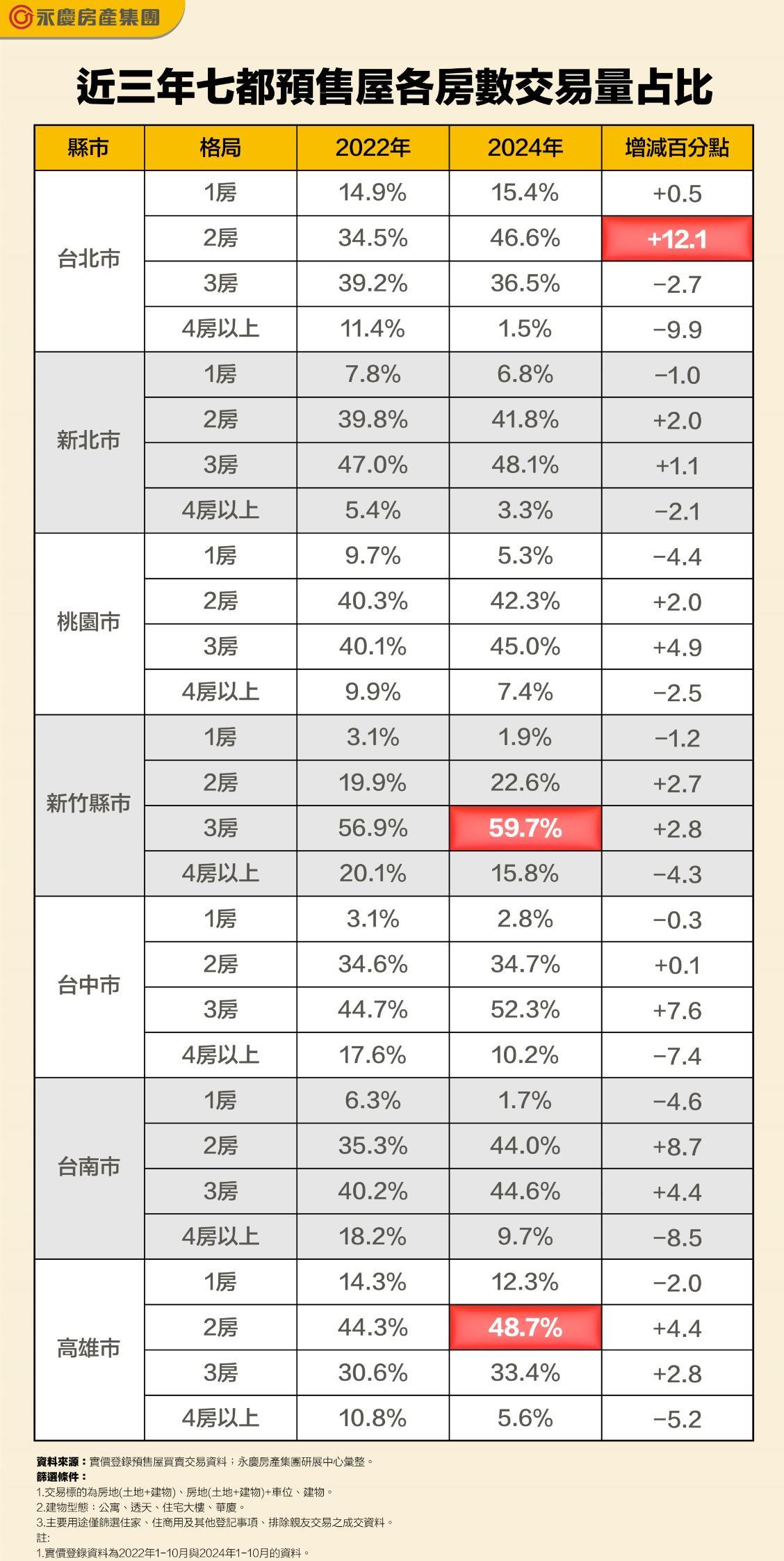 受高房價壓力影響,七都購屋族群購買預售屋房數也有所變化。永慶房產集團觀察近三年七大都會區預售屋各房數交易量占比變化,在三年間,台北市2房預售屋交易占比從34.5%攀升至46.6%,攀升幅度七都最高。另外2024年高雄2房預售屋的交易占比高達48.7%,高過台北市。而2024年新竹縣市的3房交易占比將近6成,為七都之最。